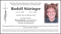 Mit dem Tod eines Menschen verliert man vieles, niemals aber die gemeinsam verbrachte Zeit. Rudolf Stäringer * 10. 10. 1956 + 24. 1. 2026 Altdorf, den 14. Februar 2026 In stiller Trauer: Marion Hergeth, Lebensgefährtin im Namen aller Verwandten, Freunde und Bekannten Trauergottesdienst mit anschließender Urnenbeisetzung am Freitag, 20. Februar 2026, um 12.30 Uhr in Arth. Für bereits erwiesene und noch zugedachte Zeichen der Anteilnahme herzlichen Dank.