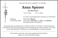 Ein gutes Herz hat aufgehört zu schlagen. Anna Spierer geb. Blenninger * 23. 4. 1939 + 15. 2. 2026 In Liebe und Dankbarkeit nehmen wir Abschied: Kapfing, Dein Sohn Martin im Februar 2026 Dein Sohn Christian mit Alex und Valentin im Namen aller Verwandten Trauerandacht am Mittwoch, 25. Februar 2026, um 19 Uhr in der Pfarrkirche in Vilsheim. Der Trauergottesdienst ist am Samstag, 28. Februar 2026, um 10 Uhr in der Pfarrkirche in Vilsheim mit anschließender Urnenbeisetzung. Für bereits erwiesene und noch zugedachte Anteilnahme sagen wir recht herzlichen Dank.