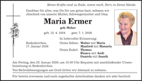 Meine Kräfte sind zu Ende, nimm mich, Herr, in Deine Hände. Dankbar für alles, was Du für uns getan hast, nehmen wir Abschied von unserer Mutter, Schwiegermutter und Oma Maria Ermer geb. Weber geb. 12. 4. 1934 gest. 7. 1. 2026 In liebevoller Erinnerung: Bodenkirchen, Deine Söhne: Walter mit Maria 17. Januar 2026 Manfred mit Manuela Deine Enkel: Thomas Bianca mit Andi Daniela mit Jannik Am Freitag, den 23. Januar 2026, um 10.30 Uhr Requiem mit anschließender Urnenbeisetzung in Bodenkirchen. Von Beileidsbezeigungen am Grab bitten wir Abstand zu nehmen. Für bereits erwiesene und noch zugedachte Anteilnahme danken wir sehr herzlich.