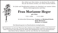 Nur Arbeit war Dein Leben, nie dachtest Du an Dich. Nur für die Deinen streben, war Deine höchste Pflicht. In Liebe und Dankbarkeit nehmen wir Abschied von unserer lieben Mutter, Schwiegermutter und Oma Frau Marianne Heger geb. Glatz * 22. 3. 1938 + 8. 2. 2026 In liebevoller Erinnerung: Carmen und Reinhard Glocke Heike Blochwitz Michael und Isabell Die Bestattung hat im Familienkreis stattgefunden. Wir bedanken uns bei der Pfarrerin Frau Haberl, dem BKH Landshut, dem Seniorenheim Curanum, dem Hausarzt Dr. Stieß, dem Pflegedienst Lena aus Geisenhausen, dem Roten Kreuz Adlkofen und für alle Zeichen der Anteilnahme.