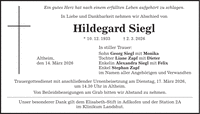 Ein gutes Herz hat nach einem erfüllten Leben aufgehört zu schlagen. In Liebe und Dankbarkeit nehmen wir Abschied von Hildegard Siegl * 10. 12. 1933 + 2. 3. 2026 In stiller Trauer: Sohn Georg Siegl mit Monika Altheim, Tochter Liane Zapf mit Dieter den 14. März 2026 Enkelin Alexandra Siegl mit Felix Enkel Stephan Zapf im Namen aller Angehörigen und Verwandten Trauergottesdienst mit anschließender Urnenbeisetzung am Dienstag, 17. März 2026, um 14.30 Uhr in Altheim. Von Beileidsbezeigungen am Grab bitten wir Abstand zu nehmen. Unser besonderer Dank gilt dem Elisabeth-Stift in Adlkofen und der Station 2A im Klinikum Landshut.