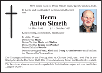 Herr, nimm mich in Deine Hände, meine Kräfte sind zu Ende. In Liebe und Dankbarkeit nehmen wir Abschied von Herrn Anton Simeth * 28. März 1948 + 21. Oktober 2025 Klöpflesberg, Michelsdorf, Haidhäuser In stiller Trauer: Deine Frau Maria Deine Tochter Maria mit Walter Deine Tochter Regina mit Norbert Deine Enkelin Kerstin Deine Schwager Franz, Alois und Georg Aschenbrenner mit Familien im Namen aller Verwandten Der Trauergottesdienst ist am Freitag, den 31. Oktober 2025, um 14.00 Uhr in der Stadtpfarrkirche Furth im Wald. Die Urnenbeisetzung findet im Familienkreis statt. Für bereits erwiesene und noch zugedachte Anteilnahme sagen wir ein herzliches 'Vergelt's Gott'.