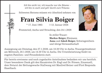 Ich bin nicht tot, ich tausche nur die Räume - ich bin in euch und geh' durch eure Träume. Schweren Herzens müssen wir Abschied nehmen von Frau Silvia Boiger * 17. Juni 1965 + 12. Januar 2026 Frommried, Ascha und Straubing, den 24.1.2026 In stiller Trauer: Markus Boiger, Ehemann Anna und Jakob Boiger, Schwiegereltern und übrige Verwandtschaft Aussegnung am Dienstag, den 27.1.2026, um 18.30 Uhr in Ascha. Trauergottesdienst am Mittwoch, 28.1.2026, um 14.30 Uhr in Ascha. Die Urnenbeisetzung findet im engsten Familien- und Freundeskreis statt. Für bereits erwiesene und noch zugedachte Anteilnahme bedanken wir uns herzlich. Unser besonderer Dank gilt den Hausärzten Dr. Engl und Dr. Friesen, Zinzenzell, dem Notarzt der Rettungswache Stallwang mit Manfred Reiner und First Responda Haselbach.