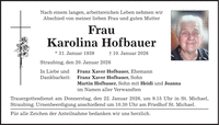 Nach einem langen, arbeitsreichen Leben nehmen wir Abschied von meiner lieben Frau und guten Mutter Frau Karolina Hofbauer * 31. Januar 1939 + 10. Januar 2026 Straubing, den 20. Januar 2026 In Liebe und Franz Xaver Hofbauer, Ehemann Dankbarkeit: Franz Xaver Hofbauer, Sohn Martin Hofbauer, Sohn mit Heidi und Joanna im Namen aller Verwandten Trauergottesdienst am Donnerstag, den 22. Januar 2026, um 9.15 Uhr in St. Michael, Straubing. Urnenbeerdigung anschießend um 10.30 Uhr am Friedhof St. Michael. Für alle Zeichen der Anteilnahme bedanken wir uns herzlich.