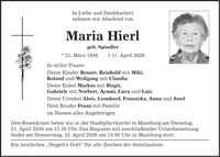 In Liebe und Dankbarkeit nehmen wir Abschied von Maria Hierl geb. Spindler * 31. März 1936 + 11. April 2026 In stiller Trauer: Deine Kinder Renate, Reinhold mit Miki, Roland und Wolfgang mit Claudia Deine Enkel Markus mit Birgit, Gabriele mit Norbert, Ayumi, Luca und Luis Deine Urenkel Alois, Leonhard, Franziska, Anna und Josef Dein Bruder Franz mit Familie im Namen aller Angehörigen Den Rosenkranz beten wir in der Stadtpfarrkirche in Mainburg am Dienstag, 21. April 2026 um 17.30 Uhr. Das Requiem mit anschließender Urnenbeisetzung findet am Donnerstag, 23. April 2026 um 14.00 Uhr in Mainburg statt. Ein herzliches ,,Vergelt's Gott'' für alle Zeichen der Anteilnahme.