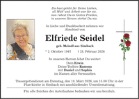 Du hast gelebt für Deine Lieben, all Müh' und Arbeit war für sie, nun ruhest Du in Gottes Frieden, in unseren Herzen stirbst Du nie. In Liebe und Dankbarkeit nehmen wir Abschied von Elfriede Seidel geb. Meindl aus Simbach * 2. Oktober 1947 + 28. Februar 2026 In unseren Herzen lebst Du weiter: Dein Erwin Deine Tochter Ramona mit Daniel und Sophia im Namen aller Verwandten Trauergottesdienst am Dienstag, den 10. März 2026, um 15.00 Uhr in der Pfarrkirche in Simbach mit anschließender Urnenbestattung. Für alle Zeichen der Anteilnahme bedanken wir uns herzlich.
