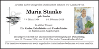 In tiefer Liebe und großer Dankbarkeit nehmen wir Abschied vonMaria Stankogeb. Presler* 3. März 1934 _ 6. Februar 2026In stiller Trauer:Die Kinder, Enkelkinder und Urenkelkinderim Namen aller AngehörigenTrauergottesdienst mit anschließender Beerdigung am Donnerstag,den 12. Februar 2026, um 12.00 Uhr in der Frauenkirche Altdorf.Für bereits erwiesene und noch zugedachte Anteilnahme bedanken wir uns herzlich.