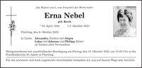 Die Mutter war's, was braucht's der Worte mehr. Erna Nebel geb. Resch * 20. April 1944 + 3. Oktober 2025 Plattling, den 8. Oktober 2025 In Liebe: Alexandra, Tochter mit Jürgen Lukas mit Johanna und Philipp, Enkel im Namen aller Verwandten Wortgottesdienst mit anschließender Beerdigung am Freitag, den 10. Oktober 2025, um 10.00 Uhr in der Friedhofskirche St. Jakob in Plattling. Für die erwiesene und noch zugedachte Anteilnahme bedanken wir uns auf diesem Wege sehr herzlich.