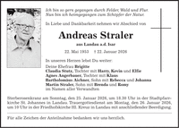 Ich bin so gern gegangen durch Felder, Wald und Flur. Nun bin ich heimgegangen zum Schöpfer der Natur. In Liebe und Dankbarkeit nehmen wir Abschied von Andreas Straler aus Landau a.d. Isar 22. Mai 1953 + 22. Januar 2026 In unseren Herzen lebst Du weiter: Deine Ehefrau Brigitte Claudia Stutz, Tochter mit Harry, Kevin und Elfie Agnes Angerbauer, Tochter mit Klaus Bartholomäus Aichner, Sohn mit Rebecca und Johanna Martin Straler, Sohn mit Brenda und Romy im Namen aller Verwandten Sterberosenkranz am Sonntag, den 25. Januar 2026, um 18.30 Uhr in der Stadtpfarrkirche St. Johannes in Landau. Trauergottesdienst am Montag, den 26. Januar 2026, um 10 Uhr in der Friedhofskirche Hl. Kreuz in Landau mit anschließender Beerdigung. Für alle Zeichen der Anteilnahme bedanken wir uns herzlich.