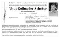 Nach einem Leben voller Arbeit und Fürsorge für seine Familie müssen wir schmerzerfüllt viel zu früh Abschied nehmen von meinem innigst geliebten Ehemann, unserem herzensguten Vater, Schwiegervater und Opa Vitus Kollmeder-Schober Wirt von Niedermünchen * 23. 10. 1955 + 27. 10. 2025 In tiefer Liebe und großer Dankbarkeit: Niedermünchen Deine Gertrud Deine Gerti mit Georg, Johannes und Antonia Deine Babsi mit Reiner, Franziska und Annalena Deine Schwestern Fanny und Maria mit Familien im Namen aller Angehörigen Aussegnung mit anschließender Totenvesper am Donnerstag, den 6. November 2025, um 18.00 Uhr in Schatzhofen. Trauergottesdienst am Freitag, den 7. November 2025, um 14.30 Uhr in der Pfarrkirche St. Michael in Schatzhofen, anschließend Urnenbeisetzung. Von Beileidsbezeigungen am Grab bitten wir Abstand zu nehmen. Anstelle von Blumen und Kränzen bitten wir um eine Spende an den Förderverein Pflegestation Ober-süßbach e.V., Bankverbindung: DE***, Kennwort: 'Vitus Kollmeder-Schober'. Für bereits erwiesene und noch zugedachte Anteilnahme danken wir herzlich.