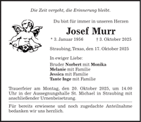 Die Zeit vergeht, die Erinnerung bleibt. Du bist für immer in unseren Herzen Josef Murr * 3. Januar 1956 + 3. Oktober 2025 Straubing, Texas, den 17. Oktober 2025 In ewiger Liebe: Bruder Norbert mit Monika Melanie mit Familie Jessica mit Familie Tante Inge mit Familie Trauerfeier am Montag, den 20. Oktober 2025, um 14.00 Uhr in der Aussegnungshalle St. Michael in Straubing mit anschließender Urnenbeisetzung. Für bereits erwiesene und noch zugedachte Anteilnahme bedanken wir uns herzlich.