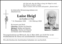 Als Gott sah, dass der Weg zu lang, der Hügel zu steil, das Atmen zu schwer wurde, legte er seinen Arm um Dich und sprach: "Komm heim." In liebevoller Erinnerung nehmen wir Abschied von Luise Heigl aus Landau a. d. Isar * 14. Dezember 1938 _ 26. Februar 2026 Es trauern um Dich: Christine, Nichte mit Familie Michael, Neffen mit Familie Roswitha, Nichte mit Familie im Namen aller Verwandten Trauergottesdienst am Mittwoch, den 4. März 2026, um 14.00 Uhr in der Friedhofskirche Hl. Kreuz mit anschließender Urnenbestattung. Für alle Zeichen der Anteilnahme bedanken wir uns herzlich.