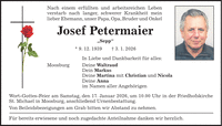 Nach einem erfüllten und arbeitsreichen Leben verstarb nach langer, schwerer Krankheit mein lieber Ehemann, unser Papa, Opa, Bruder und Onkel Josef Petermaier 'Sepp' * 9. 12. 1939 + 3. 1. 2026 In Liebe und Dankbarkeit für alles: Moosburg Deine Waltraud Dein Markus Deine Martina mit Christian und Nicola Deine Anna im Namen aller Angehörigen Wort-Gottes-Feier am Samstag, den 17. Januar 2026, um 10.00 Uhr in der Friedhofskirche St. Michael in Moosburg, anschließend Urnenbestattung. Von Beileidsbezeigungen am Grab bitten wir Abstand zu nehmen. Für bereits erwiesene und noch zugedachte Anteilnahme danken wir herzlich.