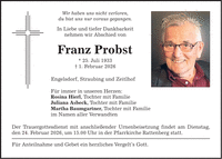 Wir haben uns nicht verloren, du bist uns nur voraus gegangen. In Liebe und tiefer Dankbarkeit nehmen wir Abschied von Franz Probst * 25. Juli 1933 _ 1. Februar 2026 Engelsdorf, Straubing und Zeitlhof Für immer in unseren Herzen: Rosina Hierl, Tochter mit Familie Juliana Asbeck, Tochter mit Familie Martha Baumgartner, Tochter mit Familie im Namen aller Verwandten Der Trauergottesdienst mit anschließender Urnenbeisetzung findet am Dienstag, den 24. Februar 2026, um 15.00 Uhr in der Pfarrkirche Rattenberg statt. Für Anteilnahme und Gebet ein herzliches Vergelt's Gott.