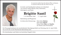 In unserem Leben hast du deinen Platz verlassen, in unseren Herzen bist du immer bei uns. In Liebe und Dankbarkeit nehmen wir Abschied von unserer lieben Mutter, Oma, Schwester, Schwägerin und Tante Brigitte Santl * 13. November 1942 + 7. April 2026 Rattenberg und Wuppertal In liebevoller Erinnerung: Dein Sohn Markus Dein Sohn Martin Deine Enkel Max und Sandra im Namen aller Verwandten Der Trauergottesdienst mit anschließender Beerdigung findet am Dienstag, den 14. April 2026, um 15.00 Uhr in der Pfarrkirche Rattenberg statt. Für Anteilnahme und Gebet ein herzliches Vergelt's Gott.