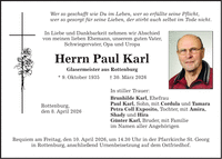Wer so geschafft wie Du im Leben, wer so erfüllte seine Pflicht, wer so gesorgt für seine Lieben, der stirbt auch selbst im Tode nicht. In Liebe und Dankbarkeit nehmen wir Abschied von meinen lieben Ehemann, unserem guten Vater, Schwiegervater, Opa und Uropa Herrn Paul Karl Glasermeister aus Rottenburg * 9. Oktober 1935 + 30. März 2026 In stiller Trauer: Brunhilde Karl, Ehefrau Paul Karl, Sohn, mit Cordula und Tamara Petra Coll Exposito, Tochter, mit Amira, Shady und Hira Günter Karl, Bruder, mit Familie im Namen aller Angehörigen Requiem am Freitag, den 10. April 2026, um 14.30 Uhr in der Pfarrkirche St. Georg in Rottenburg, anschließend Urnenbeisetzung auf dem Ostfriedhof.Rottenburg, den 8. April 2026