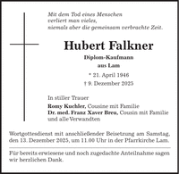 Mit dem Tod eines Menschen verliert man vieles, niemals aber die gemeinsam verbrachte Zeit. Hubert Falkner Diplom-Kaufmann aus Lam * 21. April 1946 + 9. Dezember 2025 In stiller Trauer Romy Kuchler, Cousine mit Familie Dr. med. Franz Xaver Breu, Cousin mit Familie und alle Verwandten Wortgottesdienst mit anschließender Beisetzung am Samstag, den 13. Dezember 2025, um 11.00 Uhr in der Pfarrkirche Lam. Für bereits erwiesene und noch zugedachte Anteilnahme sagen wir herzlichen Dank.