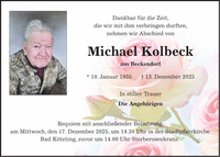 Dankbar für die Zeit, die wir mit ihm verbringen durften, nehmen wir Abschied von Michael Kolbeck aus Beckendorf * 10. Januar 1935 + 13. Dezember 2025 In stiller Trauer Die Angehörigen Requiem mit anschließender Beisetzung am Mittwoch, den 17. Dezember 2025, um 14.30 Uhr in der Stadtpfarrkirche Bad Kötzting, zuvor um 14.00 Uhr Sterberosenkranz.