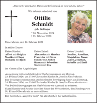 "Was bleibt sind Liebe, Dank und Erinnerung an viele schöne Jahre." In stiller Trauer: Deine Kinder: Alfred mit Brigitte Monika mit Sepp Michaela mit Rudi im Namen aller Angehörigen Wir nehmen Abschied von Ottilie Schmidt geb. Geltinger Unterahrain, den 20. Februar 2026 * 26. November 1929 _ 15. Februar 2026 Deine Enkel: Alexander mit Martina Franziska mit Steve Simone mit Jochen Hanna mit Sebastian Moritz mit Eva Aussegnung mit anschließendem Sterberosenkranz am Montag, 23. Februar 2026, um 17.00 Uhr in der Kirche St. Josef in Unterahrain. Der Trauergottesdienst mit anschließender Beerdigung findet am Dienstag, 24. Februar 2026, um 15.00 Uhr in der Kirche St. Josef in Unterahrain statt. Von Beileidsbezeigungen am Grab bitten wir Abstand zu nehmen. Statt Blumen und Kränze ist es im Sinne der Verstorbenen, den Kindergarten St. Erhard Oberahrain zu unterstützen. Ein herzliches "Vergelt's Gott" für alle Zeichen der Anteilnahme. Deine Urenkel: Josefina, Anneliese, Magdalena, Xaver, Jakob, Jonathan, Isabella und Emil