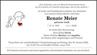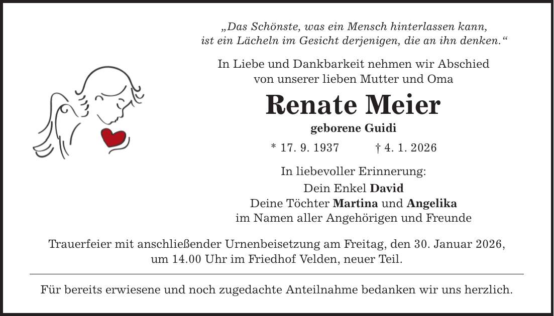"Das Schönste, was ein Mensch hinterlassen kann, ist ein Lächeln im Gesicht derjenigen, die an ihn denken." In Liebe und Dankbarkeit nehmen wir Abschied von unserer lieben Mutter und Oma Renate Meier geborene Guidi * 17. 9. 1937 _ 4. 1. 2026 In liebevoller Erinnerung: Dein Enkel David Deine Töchter Martina und Angelika im Namen aller Angehörigen und Freunde Trauerfeier mit anschließender Urnenbeisetzung am Freitag, den 30. Januar 2026, um 14.00 Uhr im Friedhof Velden, neuer Teil. Für bereits erwiesene und noch zugedachte Anteilnahme bedanken wir uns herzlich.