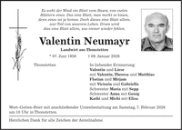 Es weht der Wind ein Blatt vom Baum, von vielen Blättern eines. Das eine Blatt, man merkt es kaum, denn eines ist ja keines. Doch dieses eine Blatt allein, war Teil von unserem Leben. Drum wird dies eine Blatt allein, uns immer wieder fehlen. Valentin Neumayr Landwirt aus Thonstetten * 07. Juni 1956 + 09. Januar 2026 Thonstetten In liebender Erinnerung: Valentin und Liese mit Valentin, Theresa und Matthias Florian und Mirjam mit Victoria und Gabriella Schwester Maria mit Sepp Schwester Anna mit Georg Kathi und Michi mit Elisa Wort-Gottes-Feier mit anschließender Urnenbestattung am Samstag, 7. Februar 2026 um 10 Uhr in Thonstetten. Herzlichen Dank für alle Zeichen der Anteilnahme.