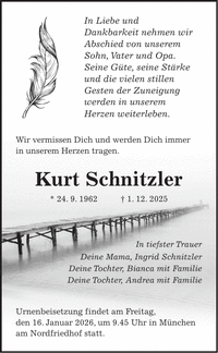 In Liebe und Dankbarkeit nehmen wir Abschied von unserem Sohn, Vater und Opa. Seine Güte, seine Stärke und die vielen stillen Gesten der Zuneigung werden in unserem Herzen weiterleben. Wir vermissen Dich und werden Dich immer in unserem Herzen tragen. Kurt Schnitzler * 24. 9. 1962 + 1. 12. 2025 In tiefster Trauer Deine Mama, Ingrid Schnitzler Deine Tochter, Bianca mit Familie Deine Tochter, Andrea mit Familie Urnenbeisetzung findet am Freitag, den 16. Januar 2026, um 9.45 Uhr in München am Nordfriedhof statt.