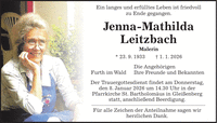 Ein langes und erfülltes Leben ist friedvoll zu Ende gegangen. Jenna-Mathilda Leitzbach Malerin * 23. 9. 1933 + 1. 1. 2026 Die Angehörigen Furth im Wald Ihre Freunde und Bekannten Der Trauergottesdienst findet am Donnerstag, den 8. Januar 2026 um 14.30 Uhr in der Pfarrkirche St. Bartholomäus in Gleißenberg statt, anschließend Beerdigung. Für alle Zeichen der Anteilnahme sagen wir herzlichen Dank.