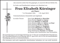 Aus unserem Leben bist Du gegangen, in unserem Herzen bleibst Du. In Liebe und Dankbarkeit nehmen wir Abschied von Frau Elisabeth Kürzinger geb. Wagner * 14. November 1934 + 23. April 2015 Untermettenbach, Geisenfeld und Aiglsbach In stiller Trauer: Dein Sohn Richard mit Roswitha Deine Tochter Ingrid mit Anton Dein Sohn Helmut mit Elfriede Deine Enkelin Julia mit Adrian und Paul Deine Enkelin Nicole mit Bruno Dein Enkel Jürgen mit Stephanie Dein Enkel Benjamin mit Bettina Deine Enkelin Ramona mit Martin Deine Enkelinnen Susanne und Verena im Namen aller Geschwister und Verwandten Die Aussegnung ist am heutigen Samstag um 17 Uhr mit anschließendem Rosenkranz. Der Trauergottesdienst ist am Montag, dem 27. April 2015, um 14 Uhr mit anschließender Beerdigung, jeweils in Untermettenbach. Für erwiesene und noch zugedachte Anteilnahme bedanken wir uns recht herzlich.