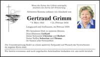 Wenn die Sonne des Lebens untergeht, leuchten die Sterne der Erinnerung. Schweren Herzens nehmen wir Abschied von Gertraud Grimm * 8. März 1952 + 21. Februar 2026 Langquaid und Aufhausen, im Februar 2026 Wir bewahren Dich in unserem Herzen: Dein Ehemann Gerhard Deine Schwester Christine und Herbert Deine Neffen Sebastian und Thomas im Namen aller Verwandten Die Urnenbeisetzung findet zu einem späteren Zeitpunkt auf Wunsch der Verstorbenen im engsten Kreis statt. Für bereits erwiesene und noch zugedachte Anteilnahme bedanken wir uns recht herzlich.
