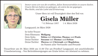 Immer wenn wir von dir erzählen, fallen Sonnenstrahlen in unsere Seelen. Unsere Herzen halten sie gefangen, als wärst du nie gegangen. Was bleibt, sind die Liebe und Erinnerung. Unser Herz ist voll Traurigkeit über den Tod von Gisela Müller * 8. Februar 1957 + 4. März 2026 Langquaid, im März 2026 In tiefer Trauer: Dein Ehemann Wolfgang Dein Sohn Tobias mit Christine, Thomas und Paula Deine Tochter Susanne mit Thomas und Fabian Deine Tochter Theresa mit Christoph und Magdalena im Namen aller Verwandte und Freunde Trauerfeier am 20. März 2026 um 11.00 Uhr am Friedhof Langquaid, mit anschließender Urnenbeisetzung. - Von Beileidsbezeigungen am Grabe bitten wir Abstand zu nehmen.