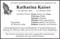 In Liebe und Dankbarkeit nehmen wir Abschied von Katharina Kaiser * 30. Oktober 1934 + 4. Februar 2026 In stiller Trauer: Franz, Sohn, mit Anna Christian, Enkel Stefanie, Enkelin Elfriede, Schwiegertochter Günther, Enkel, mit Familie Brigitte, Enkelin, mit Familie Trauergottesdienst mit anschließender Urnenbeisetzung am Freitag, 20. Februar 2026, um 14.30 Uhr in St. Peter, Ergolding. Für bereits erwiesene und noch zugedachte Anteilnahme bedanken wir uns recht herzlich.Ergolding, 18. Februar 2026