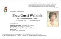 Es weht der Wind ein Blatt vom Baum, von vielen Blättern eines. Dies eine Blatt, man merkt es kaum, denn eines ist ja keines. Doch dieses eine Blatt allein war Teil von unserem Leben. Drum wird dies eine Blatt allein uns immer wieder fehlen. Rainer Maria Rilke Wir nehmen Abschied von Frau Gusti Wolniak geb. Lichtinger aus Landau a. d. Isar * 16. Dezember 1931 _ 19. Dezember 2025 In stille Trauer: Hannelore Wallinger, Schwester mit Familie Ingrid Huber, Schwester mit Familie Hannelore Lichtinger, Schwägerin mit Familie Alois Loibl im Namen aller Verwandten Trauergottesdienst am Dienstag, den 30. Dezember 2025, um 10.00 Uhr in der Friedhofskirche Hl. Kreuz in Landau, mit anschließender Urnenbestattung.