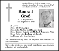 In dem Moment, in dem man erkennt, das den Menschen, den man liebt die Kraft zum Leben verlässt, ... wird alles still. Konrad Groß * 16. August 1955 _ 30. September 2025 In Liebe: Deine Ehefrau Angela Dein Sohn Markus mit Mia und Leni Deine Tochter Kerstin mit Michael, Jonas und Nina Deine Schwester Barbara mit Familie im Namen aller Angehörigen Die Urnenbeisetzung fand im engsten Familienkreis in Hunderdorf statt. Für bereits erwiesene und noch zugedachte Anteilnahme bedanken wir uns herzlich.
