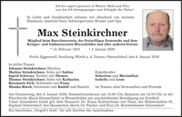 Ich bin sogern gewesen in Wiesen, Wald und Flur, nun bin Ich heimgegangen zum Schöpfer der Natur! In Liebe und Dankbarkeit nehmen wir Abschied von meinem Ehemann, unserem Vater, Schwiegervater, Bruder und Opa Max Steinkirchner Mitglied beim Burschenverein, der Freiwilligen Feuerwehr und dem Krieger- und Soldatenverein Wiesenfelden und aller anderen Vereine * 14. Februar 1953 + 3. Januar 2026 Frath, Eggerszell, Saulburg, Wörth a. d. Donau, Oberachdorf, den 6. Januar 2026 In stiller Trauer: Johanna Steinkirchner, Ehefrau Markus Steinkirchner, Sohn mit Sabine Ingrid Schwarz, Tochter mit Thomas Thomas Steinkirchner, Sohn mit Katharina Rosemarie Eich, Schwester mit Franz Monika Rösch, Schwester mit Rudolf und Familie Am Donnerstag, den 8. Januar 2026, Sammelrosenkranz um 14.00 Uhr, Requiem um 14.30 Uhr in der Pfarrkirche Mariä Himmelfahrt in Wiesenfelden mit anschließender Beerdigung am Friedhof. Unser besonderer Dank gilt dem Hausarzt Dr. Klaus Krätzschmar mit Team, der Wohnresidenz St. Raphael Schorndorf, den Hausärzten Herrn Dr. Fischer und Frau Dr. Reichenbacher Schorndorf. Ein herzliches 'Vergelt's Gott' für alle Zeichen der Anteilnahme. Enkelkinder: Sebastian und Maximilian Isabella und Leon im Namen aller Verwandten und Freunde