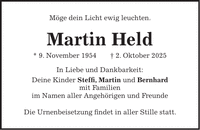 Möge dein Licht ewig leuchten. Martin Held * 9. November 1954 + 2. Oktober 2025 In Liebe und Dankbarkeit: Deine Kinder Steffi, Martin und Bernhard mit Familien im Namen aller Angehörigen und Freunde Die Urnenbeisetzung findet in aller Stille statt.