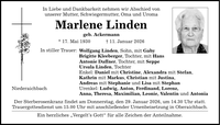 In Liebe und Dankbarkeit nehmen wir Abschied von unserer Mutter, Schwiegermutter, Oma und Uroma Marlene Linden geb. Ackermann * 17. Mai 1930 _ 11. Januar 2026 In stiller Trauer: Niederaichbach Wolfgang Linden, Sohn, mit Gaby Brigitte Kleeberger, Tochter, mit Hans Antonie Daffner, Tochter, mit Seppe Ursula Linden, Tochter Enkel: Daniel mit Christine, Alexandra mit Stefan, Kathrin mit Markus, Christian mit Justina, Andreas mit Stephanie und Lisa mit Stephan Urenkel: Ludwig, Anton, Ferdinand, Lorenz, Anna, Theresa, Maximilian, Leonie, Valentin und Antonia Der Sterberosenkranz findet am Donnerstag, den 29. Januar 2026, um 14.30 Uhr statt. Trauergottesdienst um 15.00 Uhr mit anschließender Urnenbeisetzung in Oberaichbach. Ein herzliches