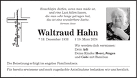 Einschlafen dürfen, wenn man müde ist, und eine Last fallen lassen, die man sehr lange getragen hat, das ist eine wunderbare Sache. Hermann Hesse Waltraud Hahn * 18. Dezember 1938 + 10. März 2026 Wir werden dich vermissen: Dein Adi Deine Kinder Horst, Jürgen und Gabi mit Familien Die Beisetzung erfolgt im engsten Familienkreis. Für bereits erwiesene und noch zugedachte Anteilnahme bedanken wir uns herzlich.