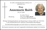 In Liebe und Dankbarkeit nehmen wir Abschied von Frau Annemarie Raith + 29. 12. 2025 In stiller Trauer: Moosburg Dein Sohn Klaus Raith im Namen aller Verwandten Heiliger Seelengottesdienst am Donnerstag, 8. Januar 2026, um 10.00 Uhr in der Friedhofskirche St. Michael, anschließend Beerdigung. Von Beileidsbezeigungen am Grab bitten wir Abstand zu nehmen. Für bereits erwiesene und noch zugedachte Anteilnahme danken wir herzlich.