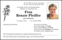 Für die Welt warst Du irgendwer, für uns warst Du die ganze Welt. In inniger Liebe und Dankbarkeit nehmen wir Abschied von Frau Renate Pfeiffer geb. Denkewitz * 9. Januar 1951 _ 14. Januar 2026 Saisting, Halle/Saale Die Urnenbeisetzung fand im engsten Familienkreis statt. Für alle Zeichen der Anteilnahme sagen wir herzlichen Dank. Du wirst uns fehlen: Dein Sohn Jens mit Gaby Deine Enkel Jonas und Viola Deine Schwester Brigitte mit Familie im Namen aller Angehörigen