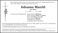 Einschlafen dürfen, wenn man das Leben nicht mehr selbst gestalten kann, das ist der Weg zur Freiheit und Trost für alle. Johanna Marchl geb. Huber * 8. 3. 1932 + 3. 3. 2026 In Liebe und Dankbarkeit: Deine Tochter Marianne Deine Tochter Ottilie mit Henry Dein Sohn Hans mit Conni Deine Enkelin Melanie und Luise mit Kindern im Namen aller Verwandten Der Trauergottesdienst findet am Mittwoch, den 18. März 2026, um 14.00 Uhr in Günzkofen mit anschließender Urnenbestattung statt. Von Beileidsbezeigungen bitten wir Abstand zu nehmen. Für bereits erwiesene und noch zugedachte Anteilnahme herzlichen Dank. Besonderen Dank an das Pflegepersonal der Station Bischof-Sailer-Platz des St. Jodokstifts.