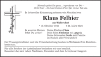 Niemals gehst Du ganz ... irgendwas von Dir - bleibt hier - Du hast Deinen Platz für immer bei uns. In liebevoller Erinnerung nehmen wir Abschied von Klaus Felbier aus Wallersdorf * 13. Oktober 1941 + 24. März 2026 In unseren Herzen Deine Ehefrau Flora lebst Du weiter: Dein Sohn Christian mit Angela Deine Schwester Gerda mit Familie im Namen aller Verwandten Der Trauergottesdienst und die Urnenbestattung fanden in Wallersdorf im Familienkreis statt. Für alle Zeichen der Anteilnahme bedanken wir uns herzlich. Besonders bei den lieben Nachbarn, Freunden und dem Ärztehaus Hiergeist.