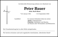 In liebevoller Erinnerung nehmen wir Abschied von Peter Bauer ehem. Korb-Bauer * 22. Januar 1951 _ 19. September 2025 Landshut In unseren Gedanken lebst du weiter: Armin, Lebenspartner Christine, Schwester, mit Familie im Namen aller Verwandten und Bekannten Die Urnenbestattung hat in aller Stille stattgefunden. Für bereits erwiesene und noch zugedachte Anteilnahme "Herzlichen Dank".