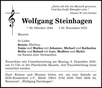 "Denn ich bin ein Mensch gewesen. Und das heißt Kämpfer sein." Johann W. von Goethe Wolfgang Steinhagen * 28. Oktober 1944 _ 20. November 2025 Mauern In Liebe: Renate, Ehefrau Sonja und Markus mit Johannes, Michael und Katharina Britta und Roland mit Lars, Madleen und Mattis im Namen aller Verwandten Trauerfeier mit Urnenbestattung am Montag, 8. Dezember 2025, um 11 Uhr in der Pfarrkirche Mauern. Auf Trauerkleidung kann verzichtet werden. Statt Kränze und Blumen bitten wir um eine Spende an SOS-Kinderdorf e.V., IBAN: DE***, ­Kennwort: "Wolfgang Steinhagen".