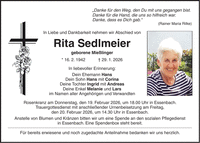 'Danke für den Weg, den Du mit uns gegangen bist. Danke für die Hand, die uns so hilfreich war. Danke, dass es Dich gab.' (Rainer Maria Rilke) In Liebe und Dankbarkeit nehmen wir Abschied von Rita Sedlmeier geborene Mießlinger * 16. 2. 1942 + 29. 1. 2026 In liebevoller Erinnerung: Dein Ehemann Hans Dein Sohn Hans mit Corina Deine Tochter Ingrid mit Andreas Deine Enkel Melanie und Lars im Namen aller Angehörigen und Verwandten Rosenkranz am Donnerstag, den 19. Februar 2026, um 18.00 Uhr in Essenbach. Trauergottesdienst mit anschließender Urnenbeisetzung am Freitag, den 20. Februar 2026, um 14.30 Uhr in Essenbach. Anstelle von Blumen und Kränzen bitten wir um eine Spende an den sozialen Pflegedienst in Essenbach. Eine Spendenbox steht bereit. Für bereits erwiesene und noch zugedachte Anteilnahme bedanken wir uns herzlich.