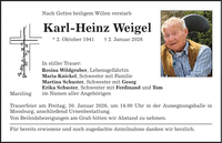 Nach Gottes heiligem Willen verstarb Karl-Heinz Weigel * 2. Oktober 1941 _ 2. Januar 2026 In stiller Trauer: Rosina Wildgruber, Lebensgefährtin Maria Knickel, Schwester mit Familie Martina Schuster, Schwester mit Georg Erika Schuster, Schwester mit Ferdinand und Tom im Namen aller Angehörigen Marzling Trauerfeier am Freitag, 30. Januar 2026, um 14.00 Uhr in der Aussegnungshalle in Moosburg, anschließend Urnenbestattung. Von Beileidsbezeigungen am Grab bitten wir Abstand zu nehmen. Für bereits erwiesene und noch zugedachte Anteilnahme danken wir herzlich.