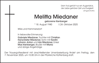 Dem Tod gehört nur ein Augenblick, der Liebe gehören Zeit und Ewigkeit. (Irmgard Erath) Melitta Miedaner geborene Kienberger * 18. August 1940 + 24. Oktober 2025 Wies und Hammersdorf In liebevoller Erinnerung: Gabriele Miedaner, Tochter mit Christian Hans-Dieter Miedaner, Sohn mit Kerstin Johann, Anton und Ida Miedaner, Enkel Max Kienberger, Bruder mit Maria und übrige Angehörige Der Trauergottesdienst mit anschließender Urnenbeisetzung findet am Freitag, den 7. November 2025, um 15.00 Uhr in der Pfarrkirche Rattenberg statt.