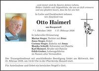 ...und immer sind da Spuren deines Lebens, Bilder, Gefühle und Augenblicke, die uns an dich erinnern und uns glauben lassen, dass du bei uns bist. In Liebe und Dankbarkeit nehmen wir Abschied von Otto Haimerl aus Kasparzell * 1. Oktober 1950 _ 17. Februar 2026 In liebevoller Erinnerung: Marion Steger, Tochter mit Peter Jonas Steger, Enkel Corinna Steger, Enkelin mit Jonas Monika Schießl, Schwester mit Familie Karl Haimerl, Bruder mit Familie Edith Gruber, Lebensgefährtin im Namen aller Verwandten Der Trauergottesdienst mit anschließender Beerdigung findet am Mittwoch, den 25. Februar 2026, um 14.45 Uhr in der Pfarrkirche Konzell statt. Für Anteilnahme und Gebet ein herzliches Vergelt's Gott.