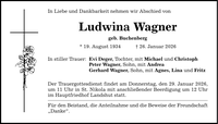 In Liebe und Dankbarkeit nehmen wir Abschied von Ludwina Wagner geb. Buchenberg * 19. August 1934 _ 26. Januar 2026 In stiller Trauer: Evi Deger, Tochter, mit Michael und Christoph Peter Wagner, Sohn, mit Andrea Gerhard Wagner, Sohn, mit Agnes, Lina und Fritz Der Trauergottesdienst findet am Donnerstag, den 29. Januar 2026, um 11 Uhr in St. Nikola mit anschließender Beerdigung um 12 Uhr im Hauptfriedhof Landshut statt. Für den Beistand, die Anteilnahme und die Beweise der Freundschaft