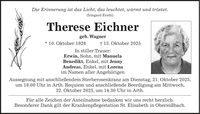 Die Erinnerung ist das Licht, das leuchtet, wärmt und tröstet. (Irmgard Erath) Therese Eichner geb. Wagner * 10. Oktober 1928 + 13. Oktober 2025 In stiller Trauer: Erwin, Sohn, mit Manuela Benedikt, Enkel, mit Jenny Andreas, Enkel, mit Lorena im Namen aller Angehörigen Aussegnung mit anschließendem Sterberosenkranz am Dienstag, 21. Oktober 2025, um 18.00 Uhr in Arth. Requiem und anschließende Beerdigung am Mittwoch, 22. Oktober 2025, um 14.30 Uhr in Arth. Für alle Zeichen der Anteilnahme bedanken wir uns recht herzlich. Besonderer Dank gilt der Krankenpflegestation St. Elisabeth in Obersüßbach.