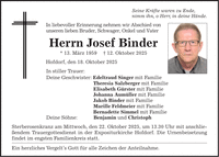 Seine Kräfte waren zu Ende,nimm ihn, o Herr, in deine Hände.In liebevoller Erinnerung nehmen wir Abschied von unseren lieben Bruder, Schwager, Onkel und VaterHerrn Josef Binder* 13. März 1959 _ 12. Oktober 2025Hofdorf, den 18. Oktober 2025In stiller Trauer:Deine Geschwister: Edeltraud Singer mit Familie Theresia Salzberger mit Familie Elisabeth Gürster mit Familie Johanna Aumüller mit Familie Jakob Binder mit Familie Marille Feldmeier mit Familie Bernadette Simmel mit FamilieDeine Söhne: Benjamin und ChristophSterberosenkranz am Mittwoch, den 22. Oktober 2025, um 13.30 Uhr mit anschließendem Trauergottesdienst in der Expositurkirche Hofdorf. Die Urnenbeisetzung findet im engsten Familienkreis statt.Ein herzliches Vergelt's Gott für alle Zeichen der Anteilnahme.